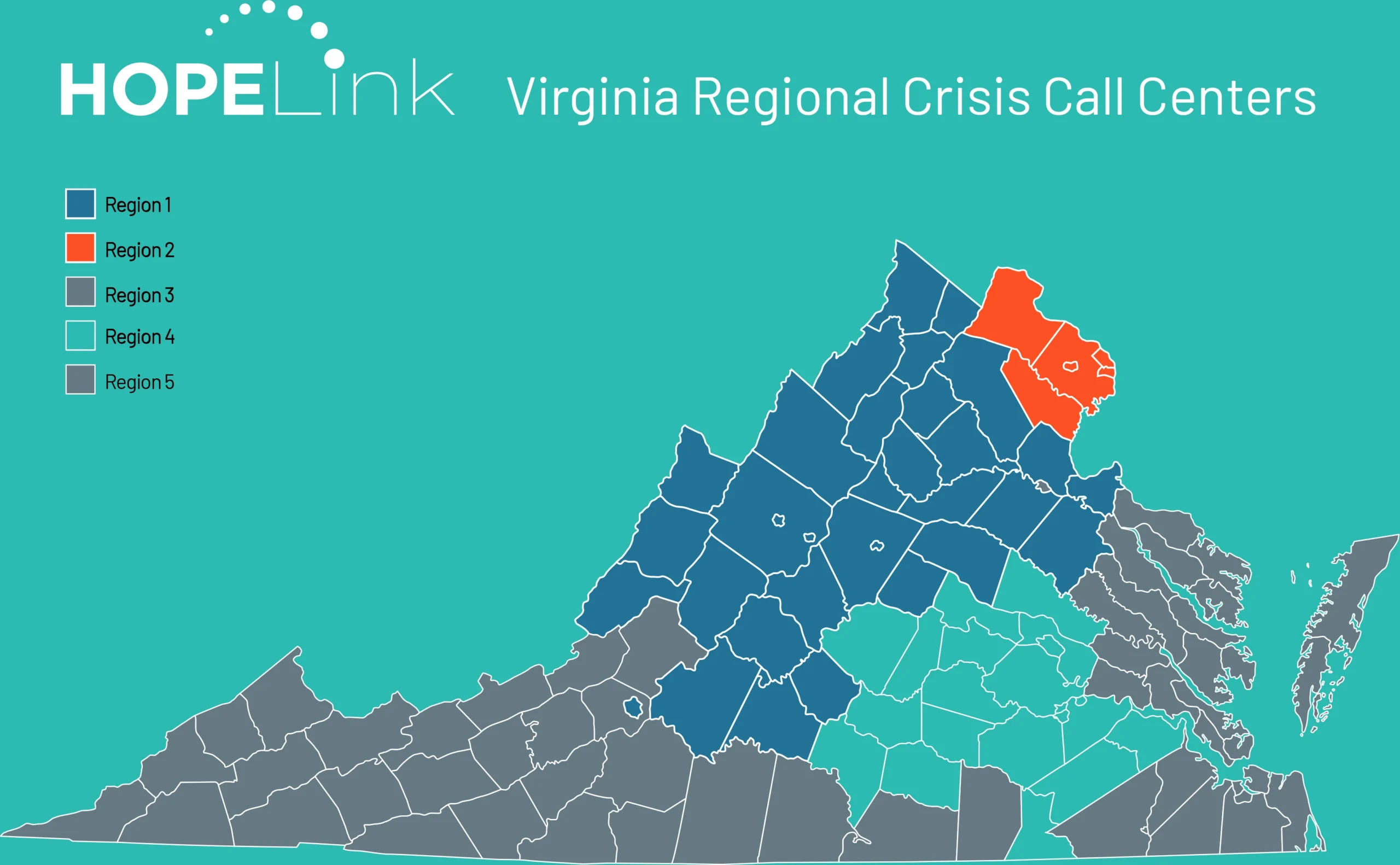 HopeLink answers 988 calls as well as numerous state and local crisis lines. In Virginia, we may connect you to local behavioral health and/or substance use disorder services and other community resources. You can always call 988, but if you are calling from Virginia, or for a loved one in Virginia, call the number for the regions outlined below to ensure you reach a Virginia-based Regional Crisis Call Center in your region.
